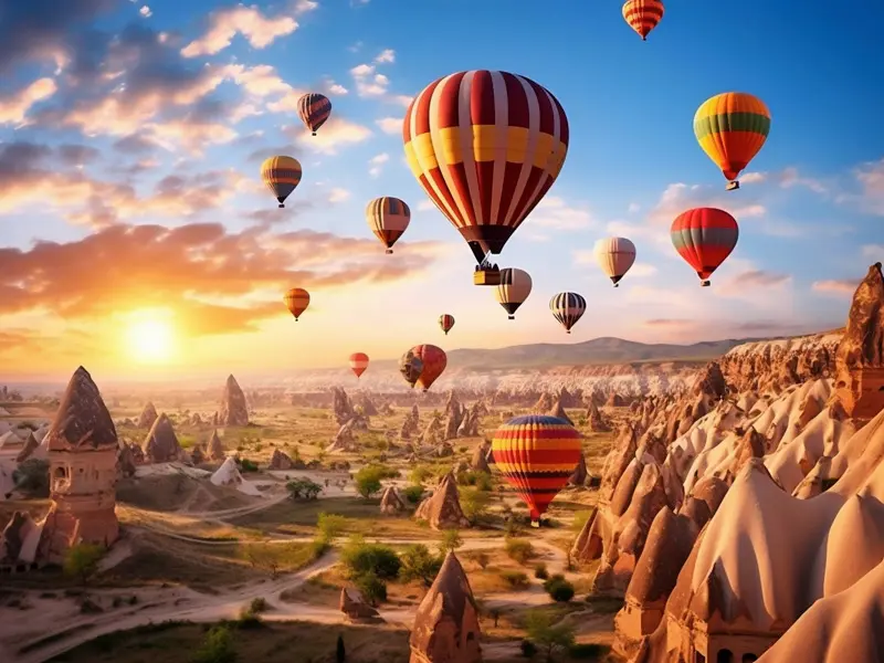 Colorful hot air balloons flying above Cappadocia’s fairy chimneys at sunrise